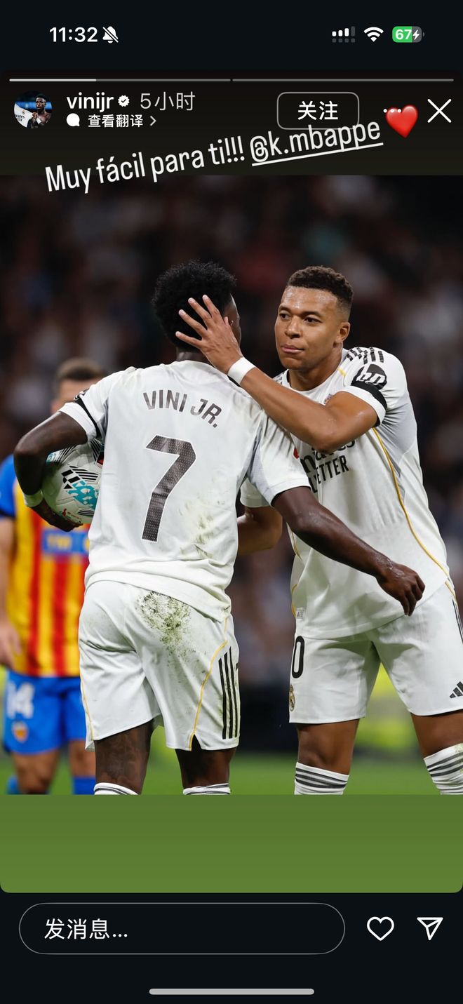 雷速体育11月2日讯 西甲第11轮,皇马4-0战胜瓦伦西亚。本场比赛皇马获得两次点球机会,第一球姆巴佩主罚命中,第二球维尼修斯主罚被扑出。赛后维尼修斯晒出与姆巴佩拥抱的合照,配文:“对你来说很容易@姆巴佩”,并配上爱心的Emoji。