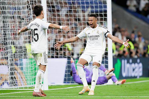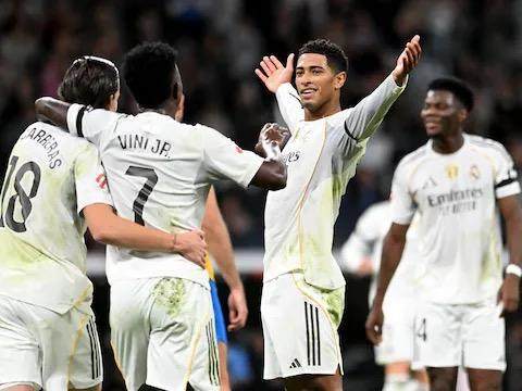 由维尼修斯领衔的进攻线发起了一波波的攻势,并积极压迫对手防线,是皇马开场第一分钟起就占据绝对上风的关键所在。此役维尼修斯除了点球没能打进之外,其余时间表现无可挑剔,他所在的左路继续成为皇马进攻的源头,巴西人与卡雷拉斯的配合也日渐娴熟,两人多次在左侧打出精彩配合。下半场阿隆索再一次将皇马7号提前换下场,这一次维尼修斯在伯纳乌的掌声中欣然离场,还在下场后主动和主帅击掌,完成了这场皆大欢喜的精彩表演。赛前姆巴佩向伯纳乌球迷展示了自己刚领取的欧洲金靴奖,以及西甲10月最佳球员奖杯。个人荣誉盆满钵满的姆总也延续着自己进球的脚步,先是点球命中打开局面,就此走出国家德比失点阴影,随后姆总又接到居莱尔助攻,打出精彩的凌空垫射破门。此役过后,姆总本赛季14场正式比赛已攻入18球,西甲11轮13球,数据爆炸程度丝毫不亚于皇马时期的C罗;姆总连续第8场西甲破门,放眼皇马队史也只在C罗一人之下。而本场为姆巴佩送出助攻的居莱尔近7次助攻都给了姆总一人,“居巴连线”已经成为皇马本赛季打开局面的重要武器。
