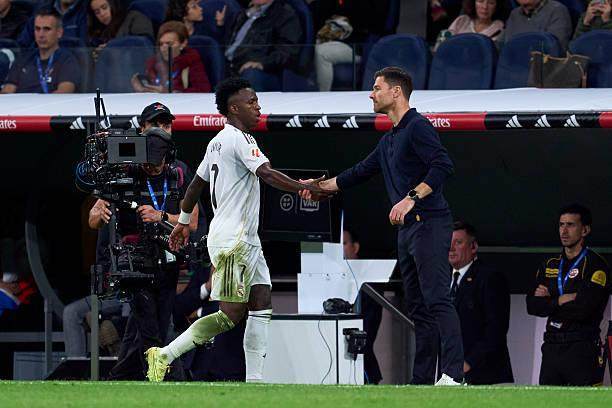 本场赛前,两队一起在伯纳乌为刚刚去世的传奇门将奥乔托雷纳进行默哀仪式,奥乔托雷纳的球员生涯曾在皇马和瓦伦西亚度过,后来作为门将教练也在瓦伦西亚和西班牙国家队从教多年,完整经历过西班牙王朝时期,执教过包括卡西利亚斯和卡尼萨雷斯在内的多名世界级门将,也是皇马和瓦伦西亚两家俱乐部共同的传奇。瓦伦西亚上赛季给皇马制造了不小麻烦,做客伯纳乌一战,出自皇马青训的杜罗读秒绝杀,帮助蝙蝠军团带走胜利,也让皇马距离西甲冠军渐行渐远。由于和维尼修斯之间素有过节,本场做客伯纳乌的瓦伦西亚球迷也对皇马7号嘘声以待。只是当前这支蝙蝠军团状态极为糟糕,根本无力对士气高涨的皇马造成太大威胁,全场下来,客队的攻势仅有一次威胁到了库尔图瓦把守的大门,其余时间基本就是皇马的进攻表演,两队的射门比是21比4,绝佳机会是4对0,控球率65%对35%,皇马从场面到比分都是压倒性的优势。国家德比一战,维尼修斯下半场被阿隆索提前换下时表现得无比愤怒,巴西人一脸不快地径直走回了更衣室,虽然后来又回到了替补席,和队友们一同庆祝了国家德比的胜利,但他的这一反应还是引起了轩然大波。后来维尼修斯主动承认错误并道歉,阿隆索也在赛前发布会上表示这件事情“已经翻篇”。此役面对和自己有着不小过节的瓦伦西亚,维尼修斯继续先发出战,并在开场后就异常活跃。