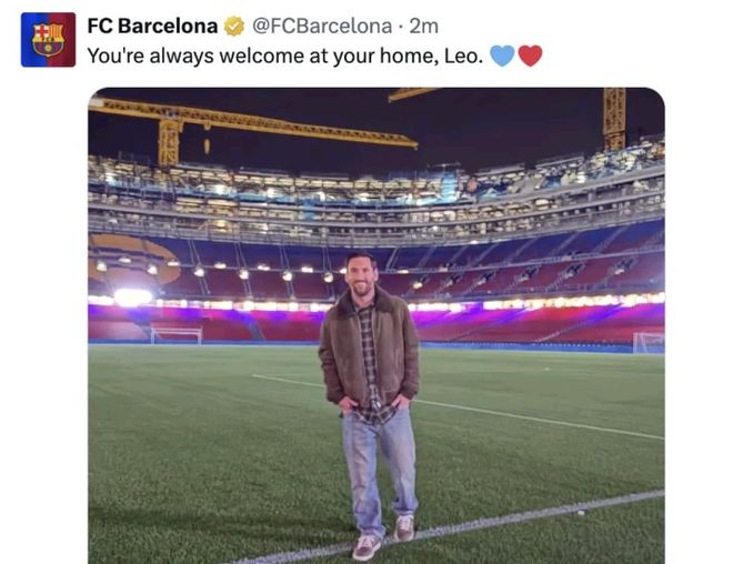 引爆社交媒体,巴萨官方表态在梅西发布社交动态后,短短不到一天的时间,浏览量就已经超过1000万,评论量也是直接逼近百万级别。无数的巴萨球迷在评论区留言,诉说着对于这位昔日巴萨领袖的怀念。各路媒体也纷纷撰文,所有人都希望梅西能够上演落叶归根的剧情,为自己的生涯画上一个神话一般的句号。巴萨官方当然也没有闲着,他们顺势抛出橄榄枝,发表动态表示:随时欢迎你回家!虽然愿望是美好的,但从目前的情况看,梅西重返巴萨几乎是不可能完成的事情。