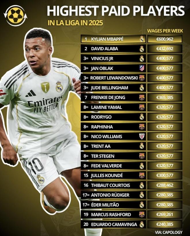 球员工资分析俱乐部分布:皇马11、巴萨7、马竞1、毕巴1。前20合计周薪约690.48万欧元;皇马约56.3%,巴萨约33.3%。顶薪段由皇马主导。薪级台阶:顶薪姆巴佩 600,962/周,比第二名高约38.9%。40万级:维尼修斯、奥布拉克、莱万、贝林厄姆。32万级拥挤:亚马尔、罗德里戈、拉菲尼亚、威廉姆斯、阿诺德、特尔施特根、巴尔韦德。28万:吕迪格、米利唐;24万:卡马文加。最高与最低差约2.5倍,内部差距可控。皇马:1名绝对顶薪 + 大量32–40万核心;后场成本稳定在28–29万区间(库尔图瓦、吕迪格、米利唐)。年龄以当打期为主,续约上调压力可控。巴萨:德容、莱万处高位,其余多集中在32万平台;亚马尔18岁即平台价,体现超前定价。风险在于莱万、特尔施特根年龄偏大且薪资高,平台人多意味着续约期可能集体抬头。其他:马竞靠奥布拉克单点顶薪;毕巴由威廉姆斯支撑天花板。结论豪门统治顶薪段;平台价群体将决定未来总薪资曲线,进入续约窗口后台阶大概率整体上移。