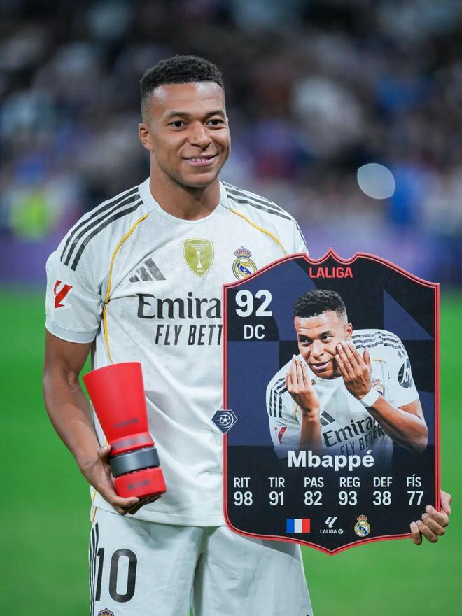 皇马历史上的新援很少有这样的待遇:迪斯蒂法诺没有,C罗一开始也没有。即便这样,相比在巴黎时国王一般的待遇和地位,姆巴佩为了加盟皇马还是做出了巨大牺牲。收入方面不说,他在战术体系内不和维尼修斯抢左边锋的位置,而是在中锋位置“重开一个号”。姆巴佩拿到欧洲金靴,甚至是在并不合适的位置超越了从前的自己。皇马上下像拿到金球奖那样为他举办庆祝仪式。佛爷再次语重心长地嘱托:“你将穿着这件你梦寐以求的白色球衣,创造属于自己的历史。”西甲第10轮对阵巴伦西亚之前,姆巴佩将近期的收获展示给伯纳乌的观众,除了金靴,还有10月最佳球员的红色奖杯。9月的西甲最佳球员也是他。这是自梅西获得2018年4月和5月最佳球员后,再次有球员蝉联这项表彰。这奖项没有巨星光环的加成,得拿出实打实的表现和数据征服评委。姆巴佩在这两个月间的7场比赛打进8球,帮助球队拿下国家德比,确立领先优势。对巴伦西亚,法国人再入2球,毫无争议地拿下全场最佳。这样他的联赛进球数就来到13粒,比第2名的“小蜘蛛”胡利安·阿尔瓦雷斯多近一倍。如今各项赛事总计贡献则是16场18球2助攻。