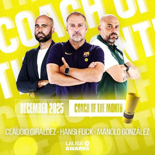西甲12月最佳主教练候选名单:弗里克(巴萨) 4场比赛全胜 进12球丢4球克劳迪奥-希拉尔德斯(塞尔塔) 4场比赛2胜1平1负 进4球丢1球马诺洛-冈萨雷斯(西班牙人) 4场比赛全胜 进5球丢1球