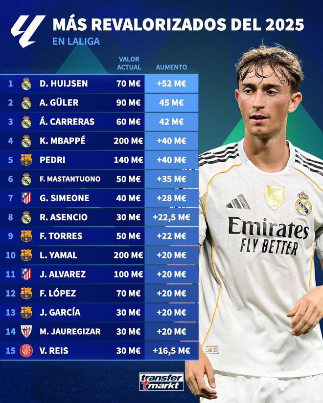 德转列2025年西甲球员身价涨幅TOP15:1. 赫伊森(皇家马德里) 7000万欧元 +5200万欧元2. 居莱尔(皇家马德里) 9000万欧元 +4500万欧元3. 阿尔瓦罗-卡雷拉斯(皇家马德里) 6000万欧元 +4200万欧元4. 姆巴佩(皇家马德里) 2亿欧元 +4000万欧元5. 佩德里(巴塞罗那) 1.4亿欧元 +4000万欧元6. 马斯坦托诺(皇家马德里) 5000万欧元 +3500万欧元7. 朱利亚诺-西蒙尼(马德里竞技) 4000万欧元 +2800万欧元8. 劳尔-阿森西奥(皇家马德里) 3000万欧元 +2250万欧元9. 费兰-托雷斯(巴塞罗那) 5000万欧元 +2200万欧元10. 亚马尔(巴塞罗那) 2亿欧元 +2000万欧元11. 胡利安-阿尔瓦雷斯(马德里竞技) 1亿欧元 +2000万欧元12. 费尔明-洛佩斯(巴塞罗那) 7000万欧元 +2000万欧元13. 霍安-加西亚(巴塞罗那) 3000万欧元 +2000万欧元14. 豪雷吉萨尔(毕尔巴鄂竞技) 3000万欧元 +2000万欧元15. 维托尔-雷斯(赫罗纳) 3000万欧元 +1650万欧元