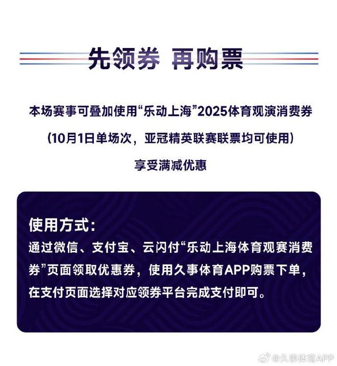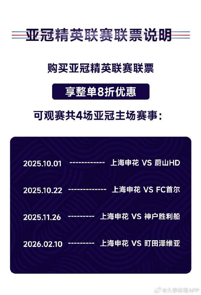 北京时间9月23日,久事体育官方发布公告,上海申花主场对阵蔚山HD的比赛明日10点开票,票价80-380元。购买亚冠精英联票享整单8折优惠。