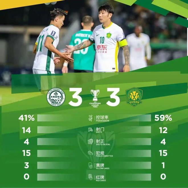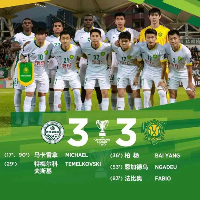 10月23日,在2025-26亚冠二级联赛小组赛第3轮中,北京国安客场3-3战平大埔。上半场比赛第17分钟,大埔由马卡雷拿先入一球。第29分钟,大埔由特梅尔科夫斯基罚中点球,再入一球。随后,国安开始展开反击。第36分钟,张稀哲右路传中,柏杨甩头攻门完成得分!第39分钟,曹永竞和张稀哲的连续攻门被对方封堵。上半场比赛结束,北京国安1-2落后。易边再战,第53分钟,张稀哲发出角球,恩加德乌头顶脚踢连续射门,帮助球队扳平比分! 第60分钟,林良铭接法比奥摆渡打入一球,但裁判吹罚越位在先。第83分钟,国安前场完成反抢,达万送出过顶传球,法比奥停球后推射破门,完成反超。第90分钟,大埔由马卡雷拿再入一球。最终,北京国安客场3-3战平大埔。