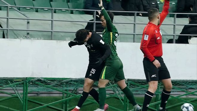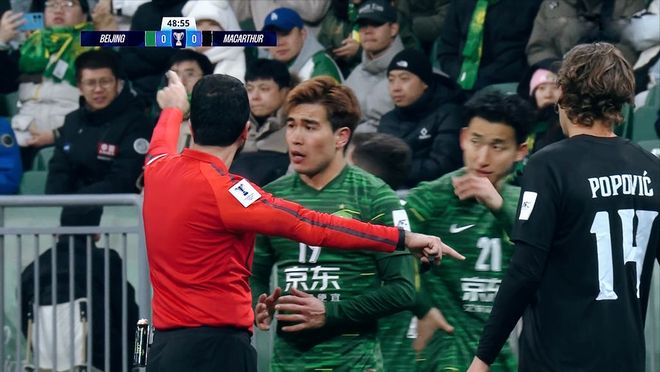 双方不断走马换将,国安换上了法比奥、林良铭等多名主力。第70分钟,国安后场传球出现巨大失误,柏杨禁区直接拉倒了对手,裁判毫不犹豫吹罚点球,哈里索耶一蹴而就,1:2!麦克阿瑟再度取得领先。丢球之后的国安,后防线依旧浑浑噩噩,不断送给对手快速反击的机会。最后时刻,双方的对抗更加激烈,黑尔韦远射击中横梁,跟上的塔尔博特补射,张健智高接低挡,国安禁区一片混乱岌岌可危。补时阶段,双方爆发冲突,柏杨累积两黄,红牌罚下。在输掉这场比赛之后,国安小组赛6轮,取得了1胜2平3负的成绩,位列小组倒数第一。