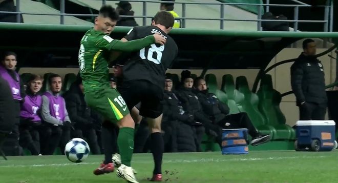 很快3分钟后,塞尔吉尼奥也还以颜色把比分扳平为1比1。就在球迷等着北京国安逆转的时候,柏杨在禁区内放倒对手前锋,主裁判判罚点球,哈里森·索维耶尔操刀主罚把球打进,客队再度把比分拉开。第77分钟,北京国安1比2落后了。再度落后,北京国安也积极展开进攻,无奈组织混乱很难打穿对手防线。临近比赛结束之前,北京国安球员一次解围时被对手撞倒(下图),于是双方球员爆发了冲突。这次冲突,对手有球员被推倒。