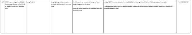 亚足联官方表示,北京国安与河内公安的行为损害了赛事声誉。(此为双方在累犯期内的第二次违规)北京国安足球俱乐部(中国)、河内公安足球俱乐部(越南) 因违反《亚足联纪律与道德准则》第50.1条,被处以6250美元罚款。罚款须依照《亚足联纪律与道德准则》第11.3条规定,自本处罚决定送达之日起30日内缴清。