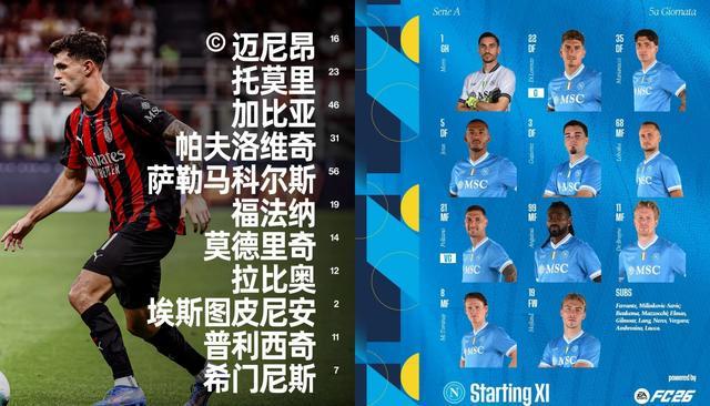 自阿莱格里上任米兰主帅后,红黑军团新赛季渐入佳境,此战面对上赛季意甲冠军那不勒斯,孔蒂的球队此前4轮全胜领跑。米兰本场派上普利希奇和希门尼斯搭档双前锋,莫德里奇、拉比奥和福法纳坐镇中场。那不勒斯则是霍伊伦突前,身后有德布劳内、麦克托米奈、安古伊萨和波利塔诺。