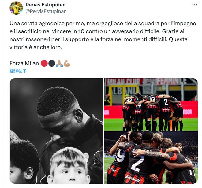 雷速体育9月29日讯 米兰在本轮意甲焦点战中2-1击败那不勒斯,新援左后卫埃斯图皮尼安首发出战,但在下半场送出红点套餐。赛后埃斯图皮尼安更新了社媒:“这是一个苦涩又甜蜜的夜晚,但我为球队在少一人作战的情况下,击败强大对手所付出的努力和牺牲感到自豪。感谢我们的红黑球迷在困难时刻给予的支持与力量。这场胜利也属于他们。”“Forza Milan(米兰加油)”