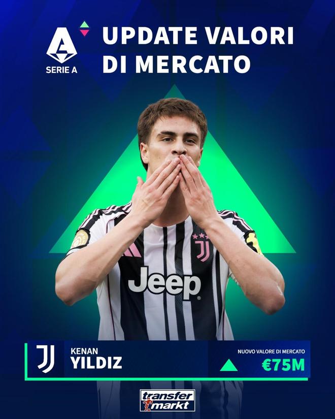 德转意大利区负责人表示:“在过去几个月里,他在个人成长方面又迈出了重要一步——他在世俱杯上表现出色,并且在本赛季开局阶段延续了强势状态。年仅20岁的他已经成为尤文图斯的核心球员。他最大的优势在于出色的技术、在进攻三区的创造力,以及令人惊讶的控球成熟度,同时他在关键时刻敢于承担责任,展现出非凡的自信。”考虑到这些因素,伊尔迪兹的身价上涨50%,从5000万欧元升至7500万欧元,这不仅合情合理,也实至名归,使他跻身意甲身价最高球员的前三名之列。
