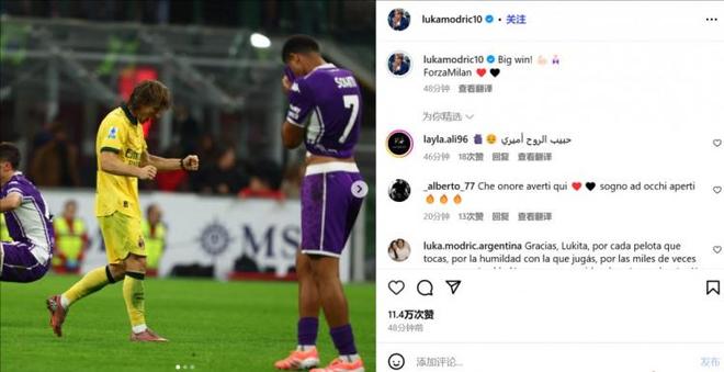 1 - 莫德里奇制胜社媒祝贺在米兰2-1击败佛罗伦萨后,莫德里奇更新社交媒体庆祝胜利的。莫德里奇晒出了自己的赛场照,配文写道:“伟大的胜利!Forza Milan。”