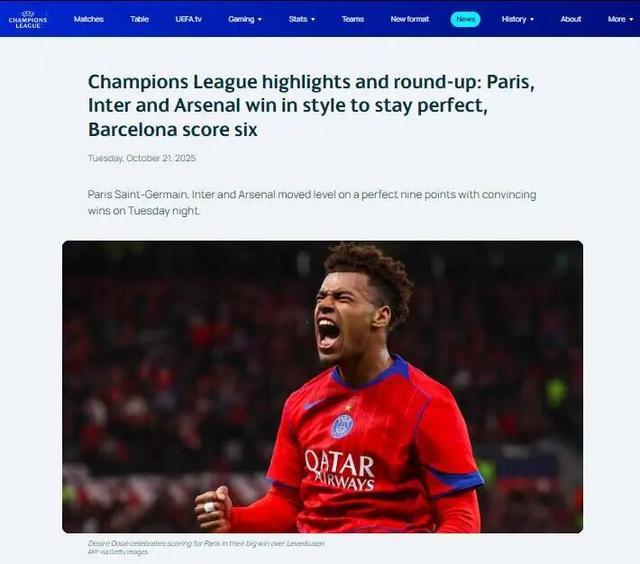 北京时间10月22日凌晨,本赛季欧冠联赛第一阶段(联赛阶段)第三轮首个比赛日迎来进球盛宴。9场比赛累计打入43球,多场强强对话打出大比分:上届冠军法甲巴黎圣日耳曼队客场7比2狂胜德甲勒沃库森队、西甲冠军巴塞罗那队主场6比1击溃希腊奥林匹亚科斯队、荷甲埃因霍温队主场6比2大胜意甲冠军那不勒斯队。“大巴黎”客场挑战勒沃库森队的较量可谓要素齐全。上届冠军开场7分钟就由帕乔首开纪录,接着勒沃库森队先是罚丢点球,然后又在第34分钟被罚下队长安德里希。不过,仅仅4分钟后“大巴黎”后防大将扎巴尔尼送上“红点套餐”,这次勒沃库森队抓住机会追平比分,并抹平人数劣势。 欧足联官网对这个比赛日的报道截图。然而,这张红牌激发“大巴黎”斗志,他们在半场结束前连入三球,又在下半场再进三球,其中前锋埃杜打入两球,克瓦拉茨赫利亚、努诺·门德斯、登贝莱、维蒂尼亚各入一球。勒沃库森队则由罚入点球的阿莱士·加西亚打入挽回颜面的一球。“大巴黎”主帅恩里克赛后坦言,这样一场9个进球、有红牌、有点球、有点球不进的比赛“观感奇特”。前三轮比赛,“大巴黎”均全取三分。恩里克认为,球队目前状态正佳,“观看这样一支球队踢球是一种享受,登贝莱也回来了。我希望大家保持状态,努力争取更多冠军。”巴萨本轮同样火力全开,与奥林匹亚科斯队的比赛,费尔明·洛佩斯上演“帽子戏法”、拉什福德“梅开二度”、亚马尔罚入点球,帮助球队6比1击败希腊劲旅。埃因霍温队主场与那不勒斯队的较量,意甲冠军由麦克托米奈先入一球,但荷甲劲旅后发制人,最终以6比2上演逆转好戏。本轮另一场强强对话踢成“一边倒”,英超阿森纳队主场4比0大胜西甲马德里竞技队,收获三连胜。比赛中,“枪手”新援哲凯赖什“梅开二度”,首次为新东家在欧冠进球。意甲国际米兰队本轮在客场4比0击败比甲圣吉罗斯联合队,同样三战全胜积9分。来源:京报体育