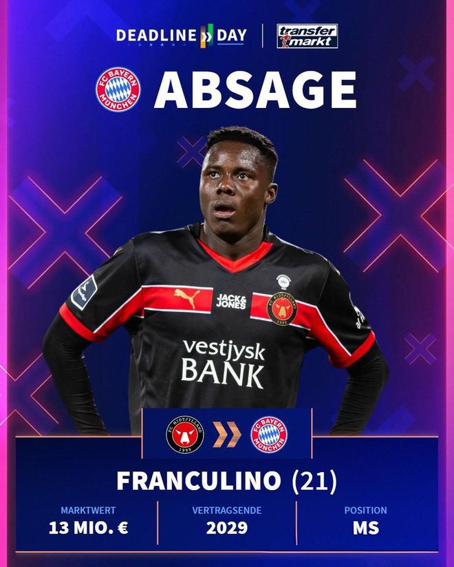 不管如何排兵布阵,米兰只能再苦苦支撑2个月时间,等到冬窗开启后必然会有所行动。目前塔雷已初步筛选出4名锋线目标。第一个还是促进希门尼斯和多夫比克的租借互换交易,目前多夫比克联赛有2球1助进账,表现略强于圣地亚哥。 第二个目标是丹麦超球队中日德兰的弗兰库利诺,这名21岁的几内亚比绍球员出自本菲卡青训,身高186㎝,惯用左脚。本赛季22场比赛交出15球3助的成绩单,德转身价1300万欧元,拜仁曾在夏窗求购过他,遭到中日德兰拒绝。弗兰库利诺没有五大联赛经验,对米兰来说签约风险比较大。