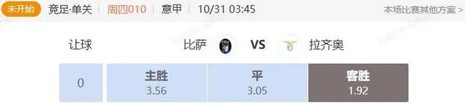 卡利亚里本赛季实力没有太大变化,始终在联赛中下游徘徊。球队上轮客场2:2战平维罗纳,目前2胜3平3负排在第14。卡利亚里积分全部来自中下游球队,主客场胜率相差不大,得分率也差不多,主要原因是球队打法并不激进,常年混迹于意甲联赛的好处就是对自身定位很准,清楚哪些球队可以应对且适合拿分。萨索洛本赛季球队重整旗鼓重新回到意甲,目前3胜1平4负排在第13。相对上次意甲联赛来说,萨索洛显得更加沉稳,同样对阵中下游球队基本都能拿到分数经历大起大落之后,萨索洛不再追求过程华丽,更看重得分效率。球队胜率38%,要高于卡利亚里的25%;客场得分率与卡利亚里主场相当,显然两支球队实力和特点非常接近。双方近两个赛季都有过降级经历,打法都趋于保守,自21-24年四次交手中,卡利亚里3胜1平占据完全优势,心理优势很大。不过大部分机构只给了平手态度,对双方都没有明显偏向。无论从基本面还是数据面来看,本场方向都很难做出判断,平局和小格局应该很有市场。但是个人偏向分胜负,支持萨索洛至少不败,因为本场大小数据普遍超过2.0,双方很可能将彼此视为志在必得的对象。竞彩选择让球玩法负,预测比分1:2或2:2。 2.专家:陈亦明竞足 周四010 意甲 比萨VS拉齐奥开赛时间:2025-10-31 03:45:00