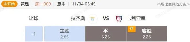 2.专家:戴永强竞足 周一009 意甲 拉齐奥VS卡利亚里开赛时间:2025-11-04 03:45:00