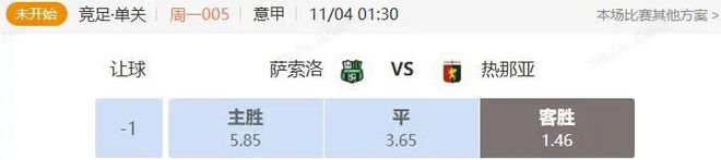 萨索洛是本赛季表现最好的升班马球队,现在已经远离降级区了。今年萨索洛重返意甲,主帅格罗索还是做了充分的准备,首发阵容中后场没有一名意大利人,整体表现还是比较稳健。队长贝拉尔迪上轮比赛没有进入大名单,目前不太明确是受伤还是轮休。热那亚上轮输给克雷莫纳后,球队宣布主帅维埃拉下课,目前暂时接手的是在球队已经担任教练长达10年的穆吉塔,虽然上任时间很短但各方面都比较熟悉,我认为对于热那亚来说不需要太多适应时间。目前热那亚阵容还是比较齐整的。本场比赛两支球队都是以保级为目标,萨索洛目前战绩上要甩开热那亚不少,加上球队历史地位也有,今天主场作战理应是被看好的,然而萨索洛面对垫底的热那亚今天还是显得让球无力,也是对热那亚的反弹比较忌惮,我认为今天热那亚很有机会客场拿分。竞彩选择让球玩法负,预测比分0:1或1:1。
