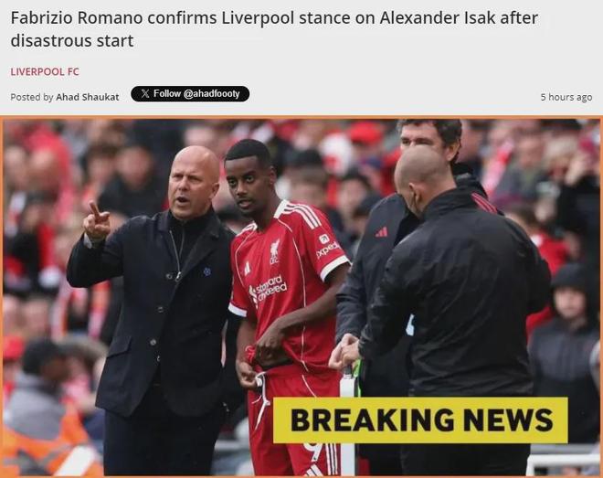 罗马诺在Here We Go podcast上谈到了伊萨克目前在利物浦的情况,他表示红军对这名前锋依然很有信心。罗马诺说:“伊萨克基本上就没有参加季前赛,他确实曾和私人教练进行单独训练,但这和从7月份开始就完整的参加季前备战是两个概念,所以这是完全不同的。而且从精神层面上说,伊萨克夏天为了加盟利物浦和纽卡斯尔开战,这是个复杂的夏天,身心都是。利物浦确信,只要伊萨克找回身体状态,他就会闪耀、会进球的。所以利物浦并不担心伊萨克的情况。”