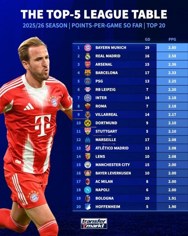 本赛季联赛场均拿分榜:及净胜球1.拜仁慕尼黑,+29球,2.80分2.皇家马德里,+16球,2.58分3.阿森纳,+15球,2.36分4.巴塞罗那,+17球,2.33分5.巴黎圣日耳曼,+13球,2.25分6.莱比锡,+7球,2.20分7.国际米兰,+14球,2.18分消息来源:转会市场