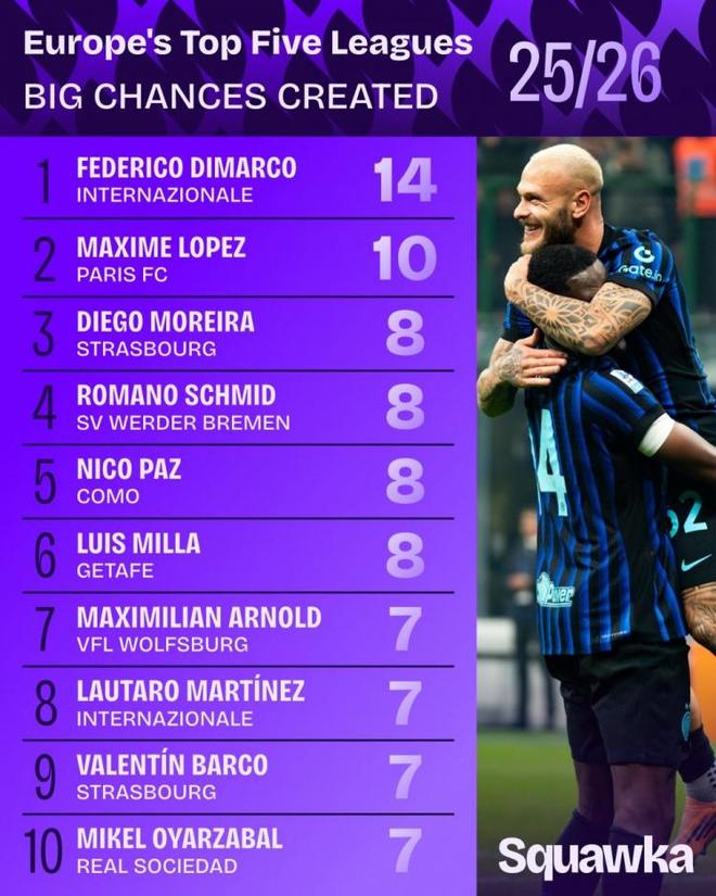 “国米完全相信恩里克能够发挥出让俱乐部当初引进他看中的潜力。毕竟,我们谈论的是一位在上赛季打入9球并助攻10次,表现非常出色的边锋。因此,现在的明确指示是,2001年出生的恩里克完全没有离队的迹象。以至于早期的市场询问已经被国米毫不犹豫地拒绝。”“在对路易斯·恩里克表示高度认可的俱乐部中,罗马走在了前列。罗马认为恩里克将在意甲也能取得成功。”消息来源:隆加里4 - 制造机会Squawka统计了本赛季球员在五大联赛创造重大机会的次数,并列出榜单,迪马尔科创造14次重大机会最多。