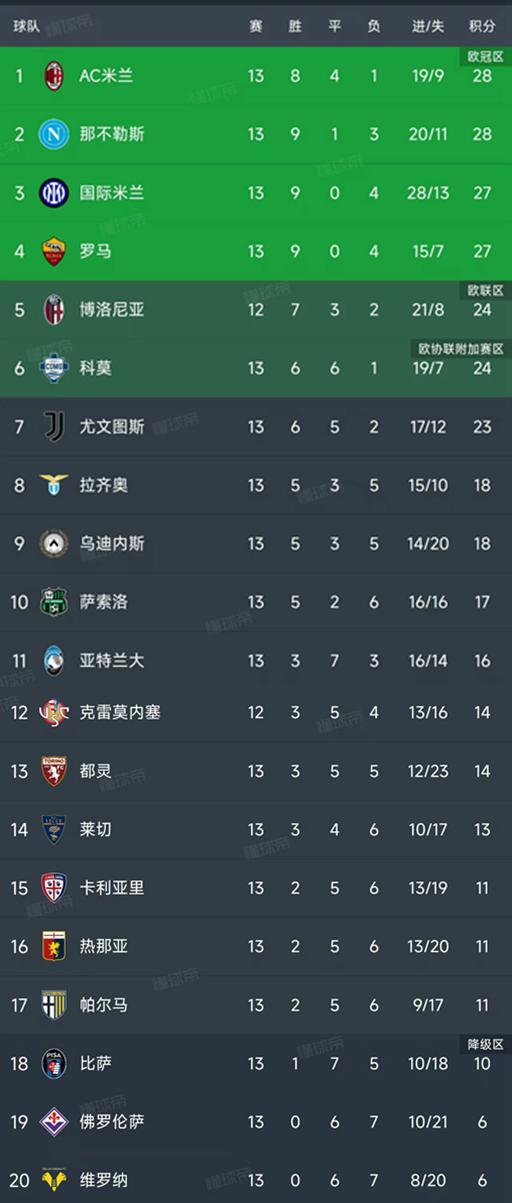 意甲最新积分榜前四名之间只相差1分,目前的领头羊是AC米兰,后者本轮在主场1-0小胜拉齐奥,迎来两连胜,莱奥攻入了制胜球。AC米兰上一次输球还是在揭幕战1-2爆冷不敌克雷莫内塞,现在他们渐入佳境连续12场不败,目前的积分和那不勒斯持平28分暂列第一名。那不勒斯本轮在客场同样是以1球小胜,1-0战胜了罗马,内雷斯攻入了唯一进球。