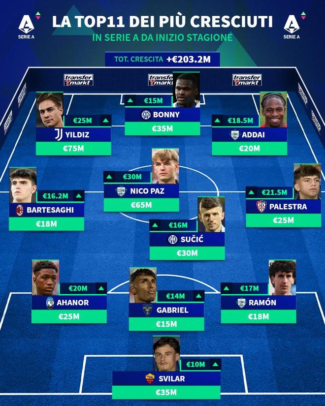 德转意甲本赛季至今身价涨幅最高11人阵容:门将斯维拉尔(罗马)3500万欧元(+1000万欧元)后卫哈科沃-拉蒙(科莫)1800万欧元(+1700万欧元)、蒂亚戈-加布里埃尔(莱切)1500万欧元(+1400万欧元)、阿哈诺尔(亚特兰大)2500万欧元(+2000万欧元)中场帕莱斯特拉(卡利亚里)2500万欧元(+2150万欧元)、苏契奇(国际米兰)3000万欧元(+1600万欧元)、尼科-帕斯(科莫)6500万欧元(+3000万欧元)、巴尔泰萨吉(AC米兰)1800万欧元(+1620万欧元)前锋阿达伊(科莫)2000万欧元(+1850万欧元)、博尼(国际米兰)3500万欧元(+1500万欧元)、凯南-伊尔迪兹(尤文图斯)7500万欧元(+2500万欧元)