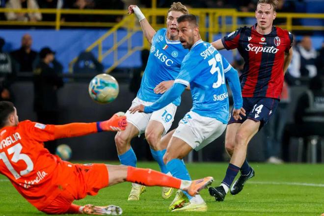 内雷斯火力全开半决赛对AC米兰,赫伊伦对位打爆德温特,靠个人能力策动第一球、又小角度打入第二球。状态出色的丹麦中锋,自然成了博洛尼亚布防的重点。伊塔利亚诺选择用同样来自北欧的挪威中卫海根与之对位,后者的表现显然比德温特出色,但仍然是不够的。海根尝试用身体对抗遏制赫伊伦,结果上半场就吃到黄牌,博洛尼亚门前也数次风声鹤唳。那不勒斯从开场就占据局面主动,埃尔马斯开场不久就与进球擦肩而过,内雷斯则在第36分钟从中场送出精妙直塞,插上领球的斯皮纳佐拉射门,被拉瓦利亚封出。眼见队友没法破门,内雷斯决定自己来。第39分钟,巴西人接到界外球,横向盘带稍作调整,随后在禁区外用左脚划出精妙的弧线,皮球几乎贴着立柱飞入球网,角度相当完美。对于那不勒斯球迷来说,这是个反向的因西涅式弧线球(前那不勒斯队长是右脚踢左路),看台上的皮耶罗则或许会想到自己的球员时代。此前,内雷斯的进球大多来自于赫伊伦之间的配合,两人也构成了目前意大利赛场上状态最好、配合最默契的双子组合之一,这次则完全是个人秀。