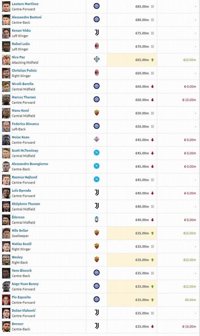 在本次身价更新中,21岁小将尼科-帕斯身价上涨1000万欧至6500万欧,小图拉姆身价下跌1500万欧至6000万欧。意甲球员身价TOP101.劳塔罗(国际米兰)8500万欧2.巴斯托尼(国际米兰)8000万欧3.伊尔迪兹(尤文图斯)7500万欧4.莱奥(AC米兰)7000万欧5.尼科-帕斯(科莫)6500万欧6.普利希奇(AC米兰)6000万欧6.巴雷拉(国际米兰)6000万欧6.马库斯-图拉姆(国际米兰)6000万欧9.夸迪奥-科内(罗马)5000万欧9.迪马尔科(国际米兰)5000万欧10.基恩(佛罗伦萨)4500万欧10.麦克托米奈(那不勒斯)4500万欧10.布翁焦尔诺(那不勒斯)4500万欧10.霍伊伦(那不勒斯)4500万欧