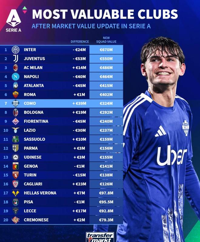 德转更新后意甲俱乐部身价排名:1. 国际米兰 6.7亿欧元 -2400万欧元2. 尤文图斯 5.5亿欧元 -5300万欧元3. AC米兰 4.86亿欧元 +1400万欧元4. 那不勒斯 4.64亿欧元 -4000万欧元5. 亚特兰大 4.15亿欧元 -4500万欧元6. 罗马 4.02亿欧元 +100万欧元7. 科莫 3.24亿欧元 +3900万欧元8. 博洛尼亚 2.92亿欧元 +1900万欧元9. 佛罗伦萨 2.4亿欧元 -4500万欧元10. 拉齐奥 2.37亿欧元 -3000万欧元11. 萨索洛 1.59亿欧元 +1000万欧元12. 帕尔马 1.56亿欧元 +300万欧元13. 乌迪内斯 1.55亿欧元 +300万欧元14. 热那亚 1.41亿欧元 -100万欧元15. 都灵 1.38亿欧元 -1500万欧元16. 卡利亚里 1.26亿欧元 +2300万欧元17. 维罗纳 9780万欧元 +700万欧元18. 比萨 9550万欧元 -100万欧元19. 莱切 9280万欧元 +1700万欧元20. 克雷莫内塞 7930万欧元 +200万欧元