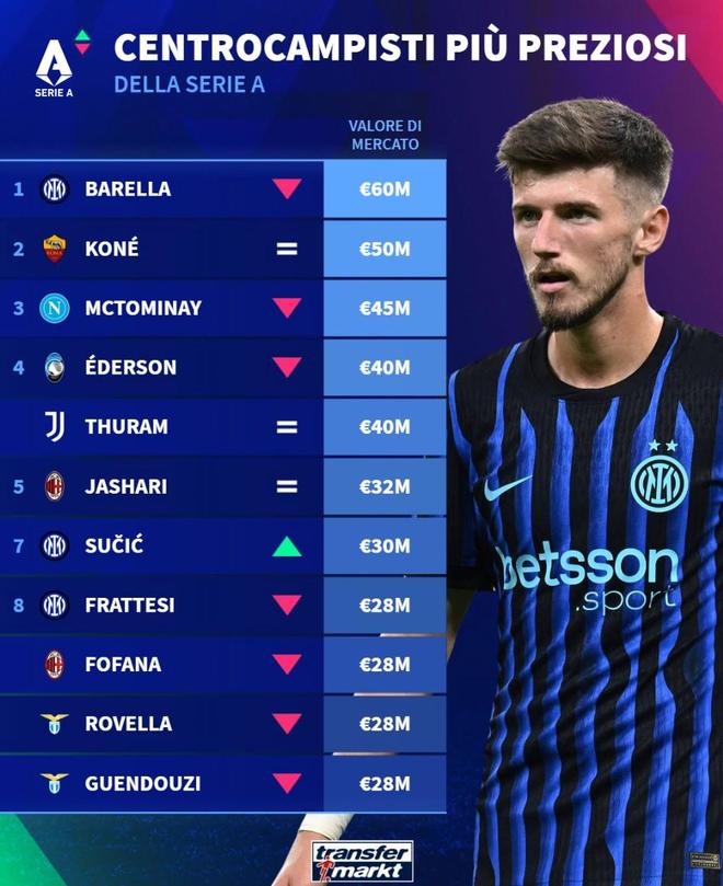 德转列意甲中场身价前10:1. 巴雷拉(国际米兰) 6000万欧元2. 夸迪奥-科内(罗马) 5000万欧元3. 麦克托米奈(那不勒斯) 4500万欧元4. 埃德松-席尔瓦(亚特兰大) 4000万欧元4. 凯夫伦-图拉姆(尤文图斯) 4000万欧元6. 亚沙里(AC米兰) 3200万欧元7. 苏契奇(国际米兰) 3000万欧元8. 弗拉泰西(国际米兰) 2800万欧元9. 优素福-福法纳(AC米兰) 2800万欧元9. 罗韦拉(拉齐奥) 2800万欧元9. 贡多齐(拉齐奥) 2800万欧元
