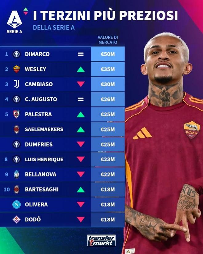 消息来源:共和报3 - 迪马尔科是世界第一德转本周更新了意甲最新身价,今日德转晒出了意甲边后卫的身价TOP10榜单的,迪马尔科5000万欧继续排在第一,罗马右后卫韦斯利升至3500万欧超越坎比亚索来到第二位的。具体TOP10如下1、迪马尔科 国米 5000万欧2、韦斯利 罗马 3500万欧3、坎比亚索 尤文 3000万欧