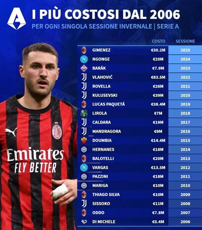 德转列2006年至2025年意甲冬窗标王: