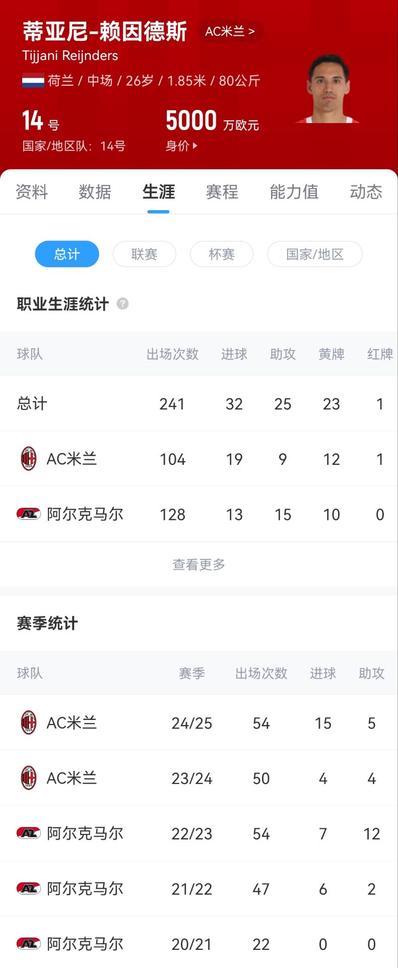 赖因德斯现年26岁,2023年AC米兰花费2050万欧从阿尔克马尔引进。本赛季赖因德斯为AC米兰出场54次打进15球,助攻5次,他与米兰合同至2030年6月,德转身价5000万欧。