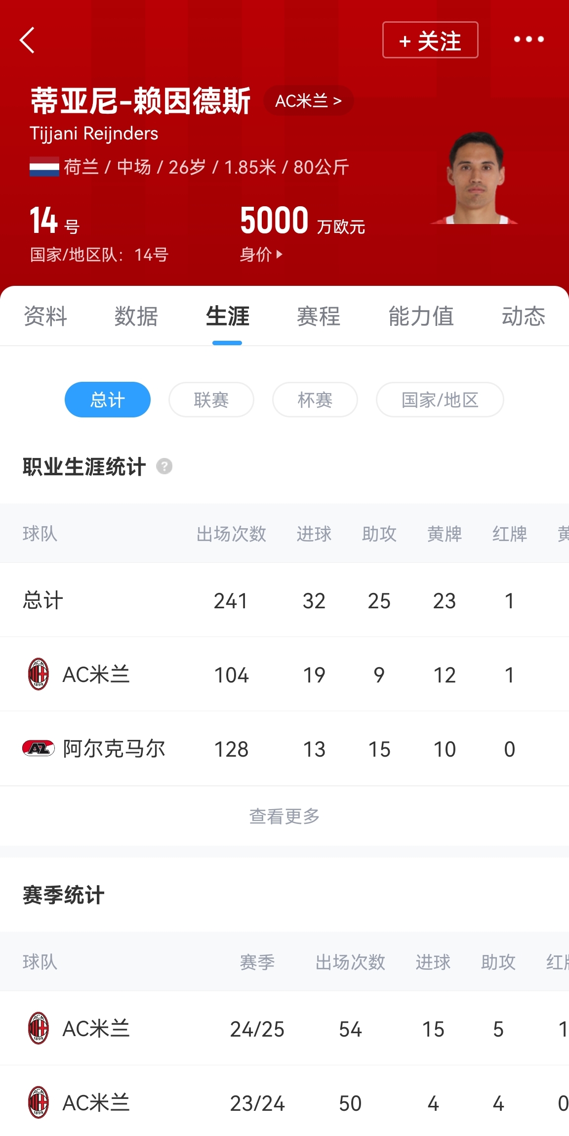 赖因德斯2023年夏天2050万欧元加盟AC米兰,目前共为米兰出场104次打入19球9助攻。今年3月,米兰与赖因德斯续约到2030年,新合同年薪翻倍。