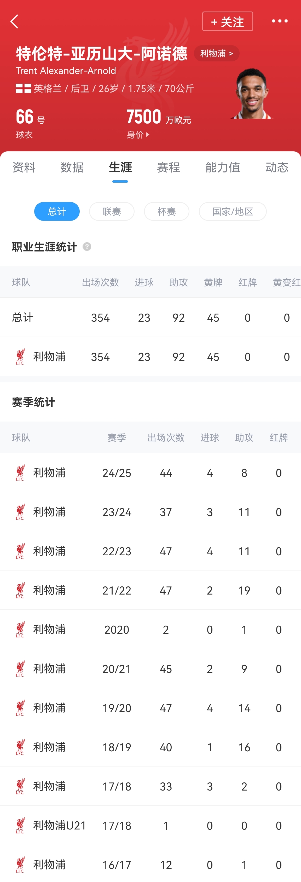 阿诺德,现年26岁,英格兰右后卫,2004年6岁时便加入利物浦青训,2016年升入利物浦一线队,目前共计出战354场,贡献23球92助,目前德转身价7500万欧。