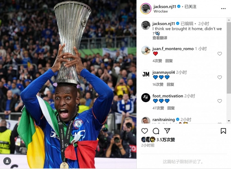 杰克逊社媒晒出头顶欧协联冠军奖杯的照片,并写道:“我想我们把它带回家了,不是吗?”