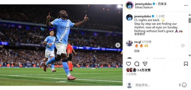 9月19日讯 在本轮欧冠,曼城2-0击败那不勒斯。本场比赛多库打进精彩进球,他也在个人社媒晒出庆祝进球照片,配文写道:“欧冠之夜回归!我们一步一步找回节奏,现在专注于周日的比赛,一切都来自上帝的恩赐。”