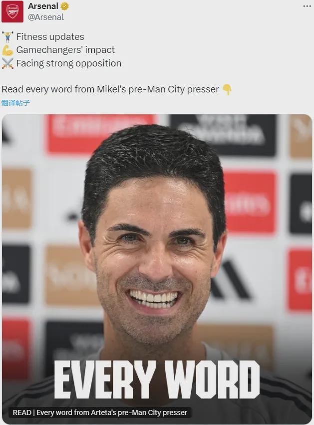 英超主帅能在面对瓜帅的曼城时连续5场保持不败,所以如果赢球的话,大家要向你致敬了!我们备战肯定是冲着胜利去的,这点毫无疑问。我认为枪迷们看到高层的变动之后肯定都想知道接下来会如何,阿森纳的未来会如何,你能透露点消息吗?未来是璀璨的,这是我唯一能说的。我对此感到非常乐观,每一次我和克伦克父子交流,感受到他们的意愿,看到他们的计划,他们对这支俱乐部的规划愿景以及这里所有的工作人员,我对前途光明没有任何怀疑。说到曼城,他们本赛季4轮比赛已经输掉2场,就像上赛季遇到的问题那样,你认为他们本赛季还能算是冠军争夺者吗?还是说你认为曼城需要1-2年时间?我认为是,毫无疑问。我很了解瓜迪奥拉和他的标准要求,以及曼城的冠军心态,再考虑到他们拥有的球员,我确信他们会是冠军争夺者。以上是发布会的部分内容。伤病信息,梅里诺和哲凯赖什可以确定没问题,但萨卡、厄德高和怀特的问题上,阿尔特塔显然又在打马虎眼……萨利巴上场比赛能进替补席的话,这场理论上来说就能出场,但莫斯克拉最近表现着实是出色,不知道阿尔特塔会不会让莫斯克拉继续首发。至于高层变动对阿尔特塔的影响,我觉得其实没啥影响,塔子主要负责竞技这块,虽然他也是足球经理,但财政这边基本不管,董事会的变动对他影响不大,他主要是和贝尔塔对接。另外看得出塔子非常会哄领导,对前任和现任都是一顿猛夸,难怪能把克伦克拿捏的死死的,这才是水平啊,能让领导心甘情愿的给预算,给项目!当然眼下最重要的还是和曼城的这场比赛,说实话曼城还是不稳定,但哈兰德、福登、多库最近状态都有起色,不要让他们建立新的信心和联系,一鼓作气拿下3分,一举抛离对手、打击其士气才是最好的!加油吧!