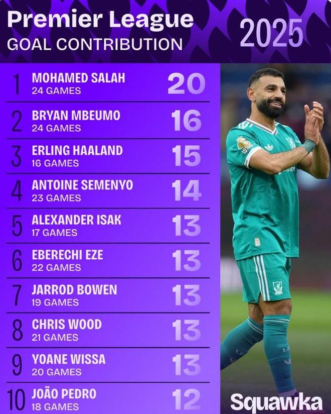 英超参与进球榜(进球+助攻),萨拉赫居首的,具体如下: