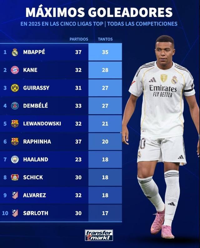 2025年五大联赛射手榜:姆巴佩37场35球居首,凯恩32场28球次之