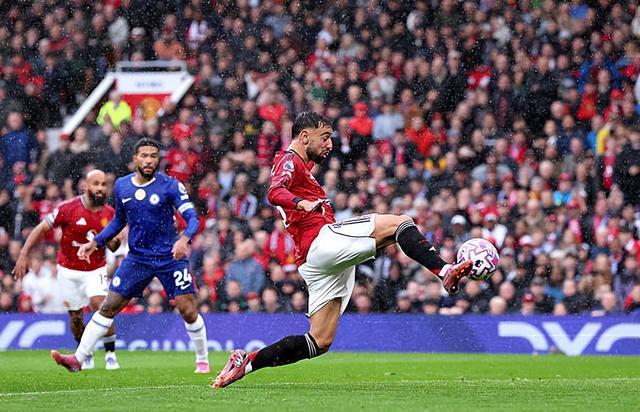 第14分钟,曼联发起进攻,马兹拉维一记传中,多古头球摆渡,门前的B费凌空得分,1-0!主裁判经过VAR确认进球有效,B费攻入了个人曼联生涯的第100粒进球!