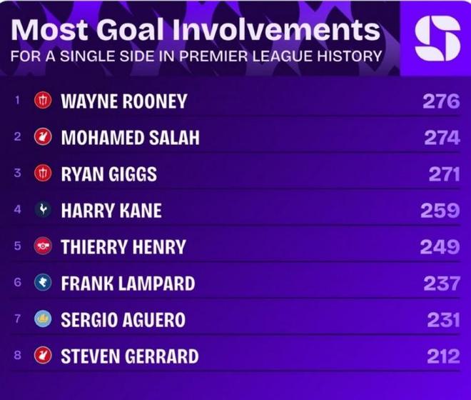 英超单一球队参与进球榜所呈现的:鲁尼(曼联 276 球)的纪录仍在等待挑战者,萨拉赫(274 球)仅差 2 球便能追平传奇,吉格斯、凯恩、亨利等名字则早已将自己的印记刻在联赛历史中。