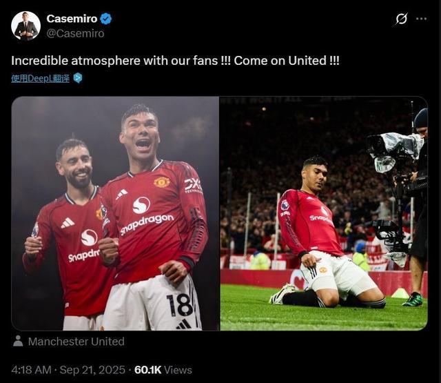 卡塞米罗庆祝胜利:球迷们营造的氛围简直太棒了!加油曼联!!!