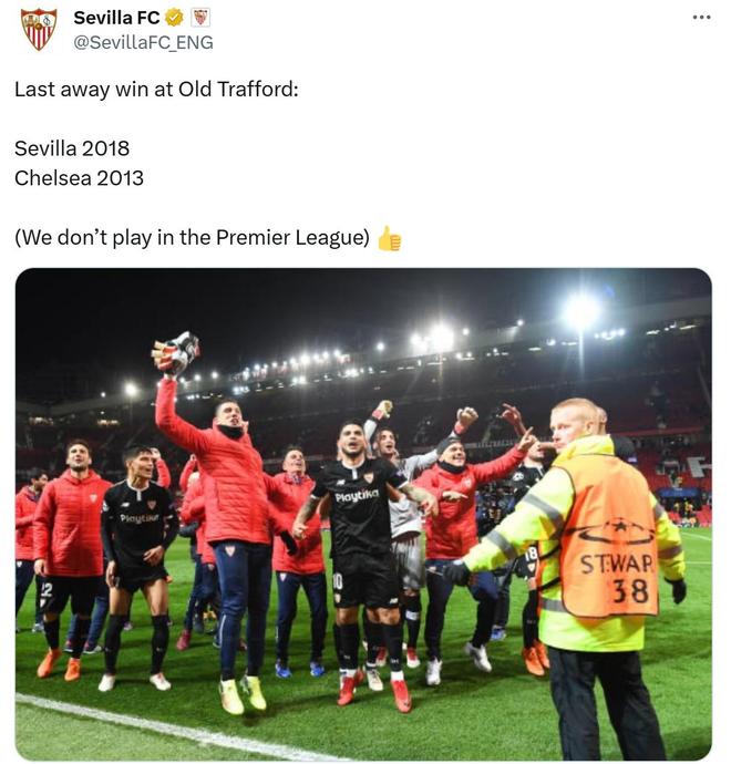 塞维利亚不仅特意点出切尔西这一尴尬纪录,更直接强调自身在该球场的取胜时间比对手更近。俱乐部在社交媒体上清晰列出关键数据:“最近一次在老特拉福德客场取胜:塞维利亚2018年,切尔西2013年”,还不忘补充一句“我们可不在