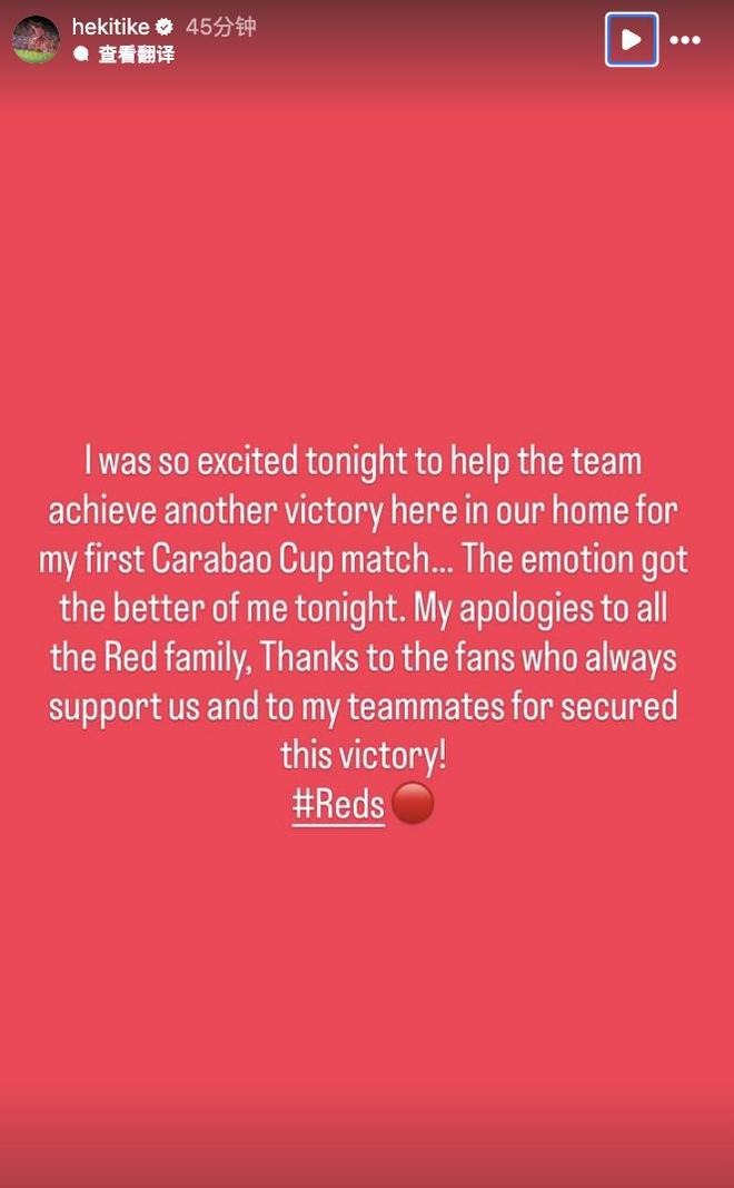 英超比赛。斯洛特在赛后新闻发布会上也直言埃基蒂克的行为“有点愚蠢”。埃基蒂克随后在社交媒体发文道歉,他写道:“我今晚非常激动,能在主场帮助球队在我参加的第一场英联杯比赛中再获一场胜利……今晚的情绪让我有些失控,向所有红军家人道歉,感谢一直支持我们的球迷,也感谢我的队友们帮助我们赢得这场胜利!”【上咪咕独家看