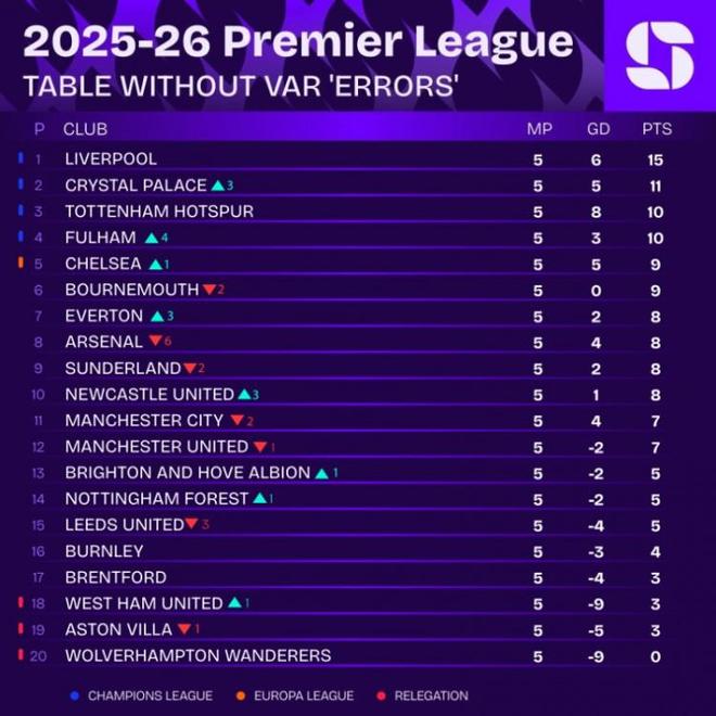 英超积分榜,利物浦仍榜首,阿森纳降至第八。Squawka官推写道:“本赛季,我们每轮比赛后都会邀请球迷们对最具争议的VAR判罚进行投票。以下是第5轮比赛后,排除VAR误判影响的