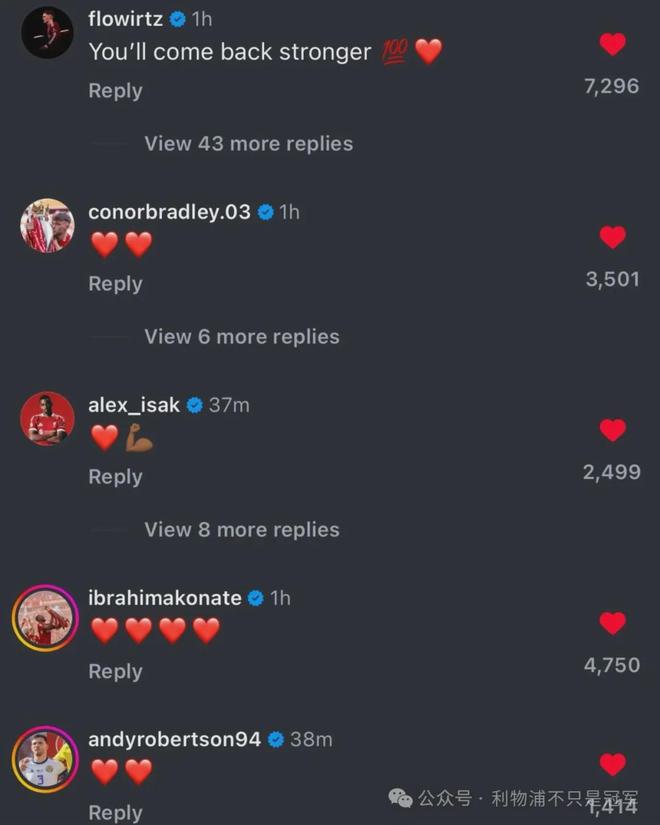 刚刚来到一个新的联赛、新的球队,在第一次出场就遭遇这么重的伤,对一个18岁的年轻球员太残酷了!利物浦队友们纷纷在社媒上为莱奥尼送上安慰,祝他归来时更加强大!