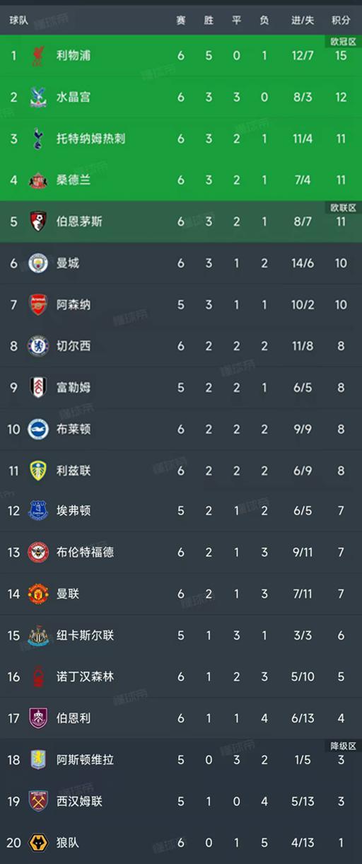 英超第6轮结束了7场比赛,最新积分榜如下!