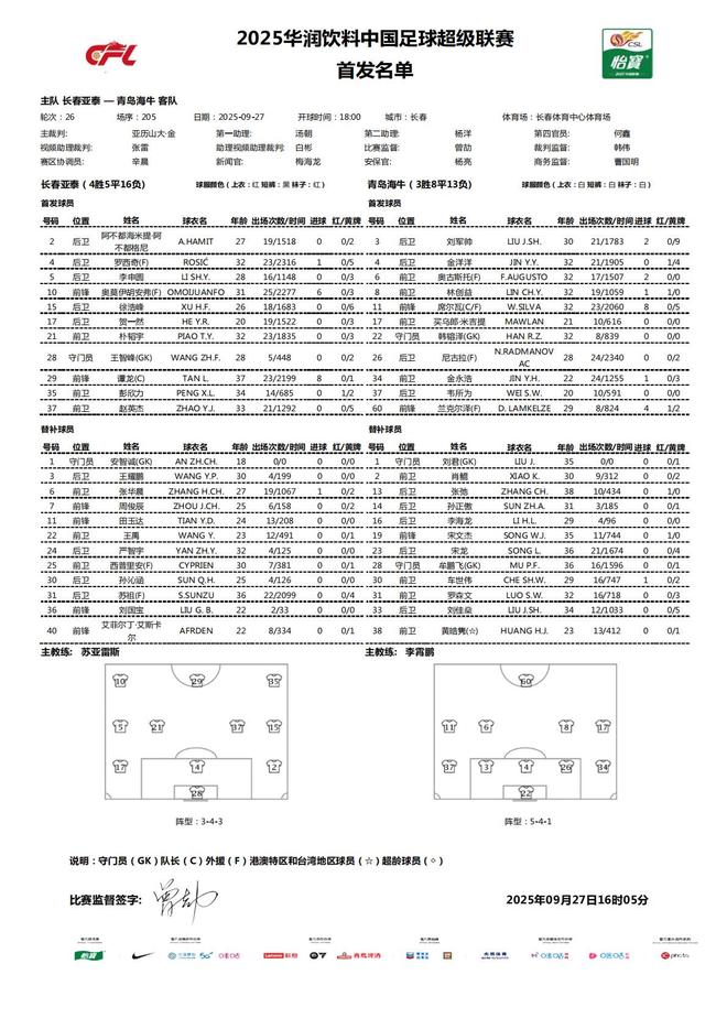 9月27日18:00,在2025赛季中超联赛第26轮的一场保级生死战中,长春亚泰主场迎战青岛海牛。赛前,两队首发名单出炉。